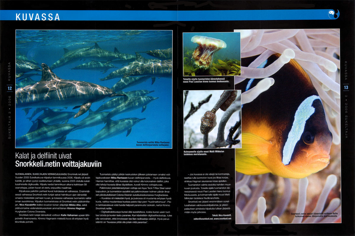Sukeltaja -lehti 3 / 2006 ( preview ) Juoksu & hiihto -lehti 6 / 2006 ( preview ) Tampereen Urheilusukeltajat / Räpyläjalat -lehti ( 03 / 2005 ja 04 / 2005 ) Sukelluskohteet.com ( galleries ) Snorkkeli.net ( galleries )